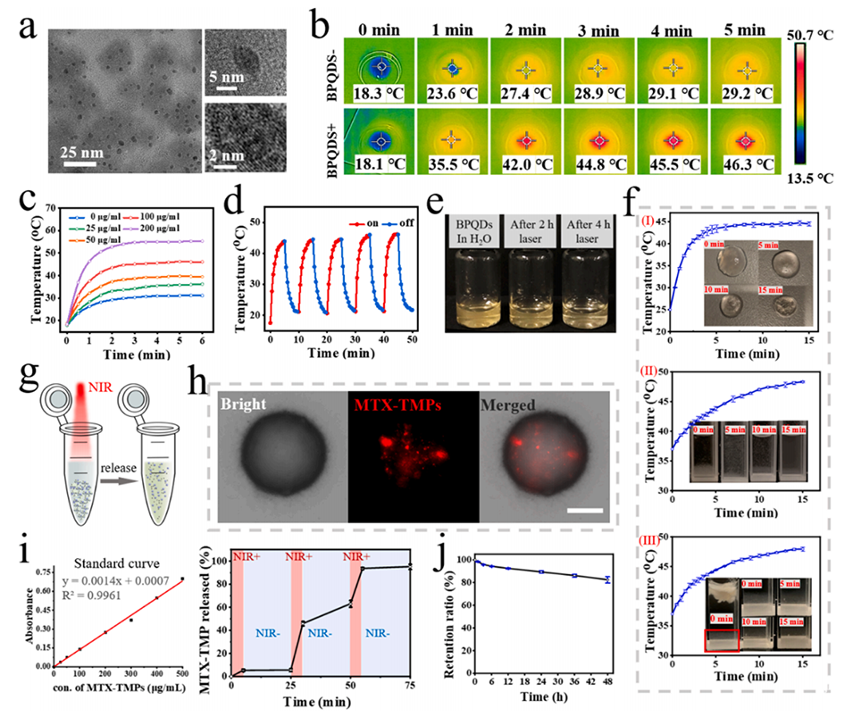 BPQDs具备优秀的近红外(NIR)光热转换能力,可以通过吸收NIR光将其转化为热能。这种热能用于使低熔点琼脂糖基质软化,从而实现MTX-TMPs的可控释放。