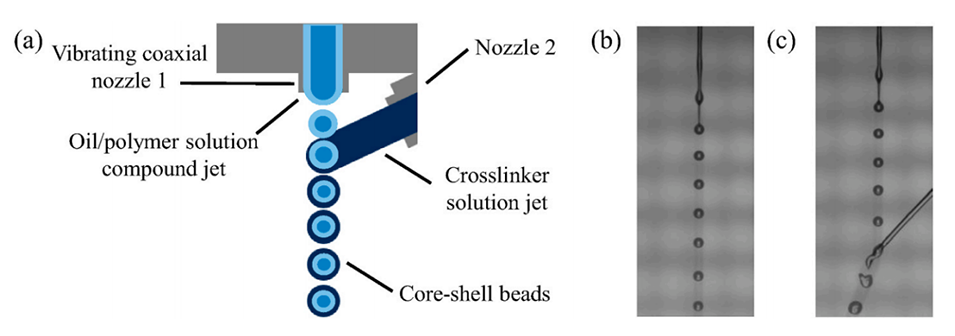 图1展示了空气微流体喷射系统的示意图(a)以及实际实验的显微图像,显示了复合射流(b)和复合射流与交联剂射流的融合(c)。图中展示了微流体技术的原理,通过振动同轴喷嘴产生复合射流,并通过交联剂射流进行封装,形成核-壳结构的微珠。
