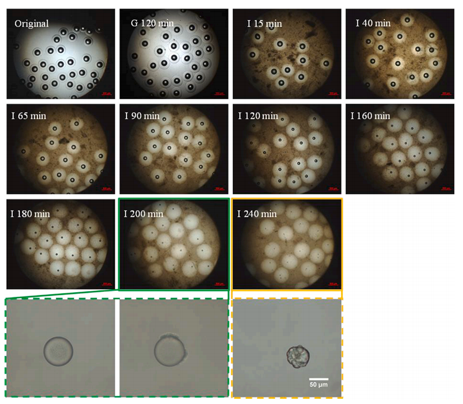 图2展示了核壳微珠在胃和肠消化条件下的显微观察图像。这些图像记录了在选定时间点(G:胃,I:肠)微珠的变化。图中显示,随着肠消化的进行,核心体积逐渐减小,表明脂质被水解。此外,当脂质消化接近完成时,核心表面出现褶皱,这可能是由于不溶性反应产物(如游离脂肪酸的钙皂或胆盐)的吸附。