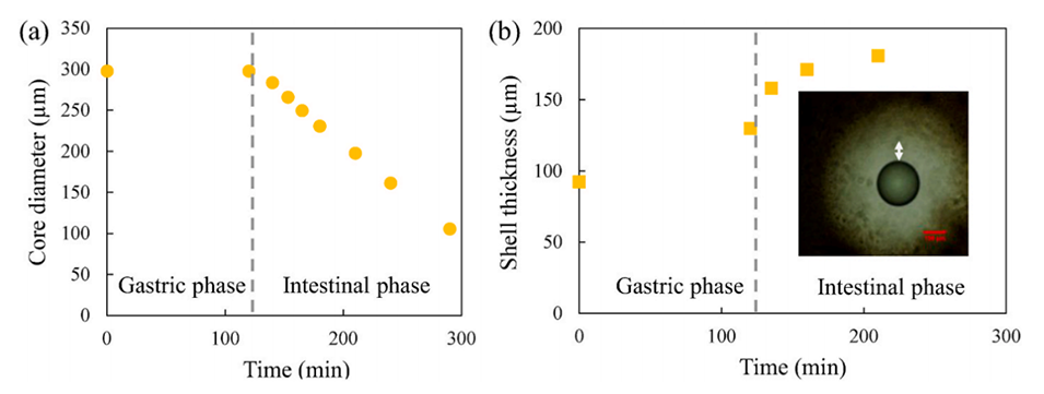 图3展示了核心直径(a)和外壳厚度(b)随消化时间的变化。图中显示,在胃和肠消化过程中,外壳厚度增加,而核心直径逐渐减小。外壳的膨胀可能是由于消化液中钙离子浓度的降低导致的离子交换,而核心直径的减小则是由于脂质的水解。