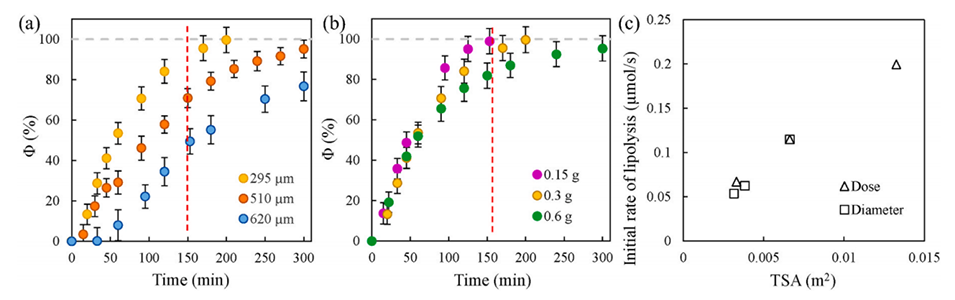 图5展示了核心体积减少随肠消化时间的变化,分别针对不同的核心直径(a)和油剂量(b)。图中显示,较小的核心直径和较低的油剂量会导致更快的脂质水解速率。此外,图c展示了初始脂解速率与总表面积(TSA)之间的关系,表明脂解速率与TSA成正比。