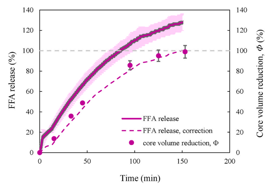 图4比较了核心体积减少(粉色填充圆圈)和游离脂肪酸(FFA)释放(粉色线)随肠消化时间的变化。图中显示,经过校正空白测量后(粉色虚线),核心体积减少与FFA释放之间达到了很好的一致性,这证明了两种方法在定量脂质消化方面的互补性。