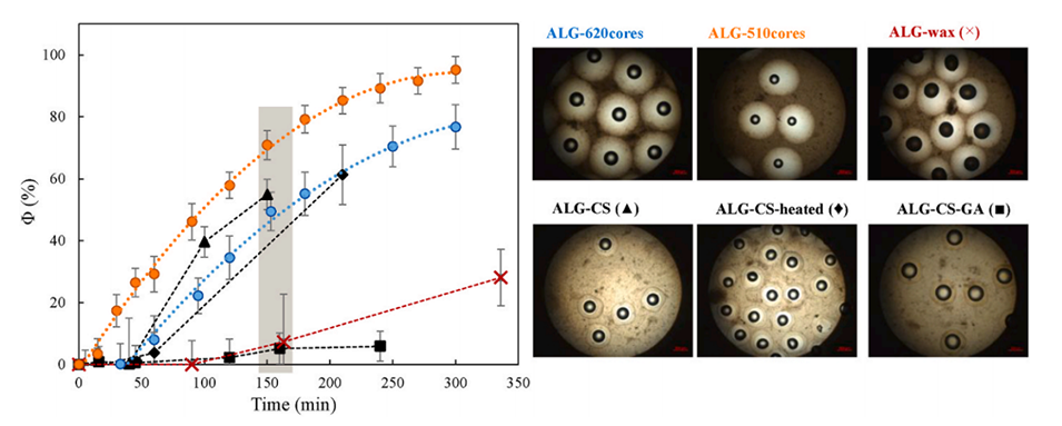 图7比较了经过不同改性处理的核-壳微珠(如添加壳聚糖、戊二醛或蜂蜡)与未改性微珠(如ALG-620cores和ALG-510cores)在肠消化过程中的脂质消化行为。图中显示,通过改变外壳(如添加壳聚糖或戊二醛)或核心(如添加蜂蜡)的组成,可以显著调节脂质水解的行为。例如,添加戊二醛或蜂蜡会显著延迟和抑制脂质水解。