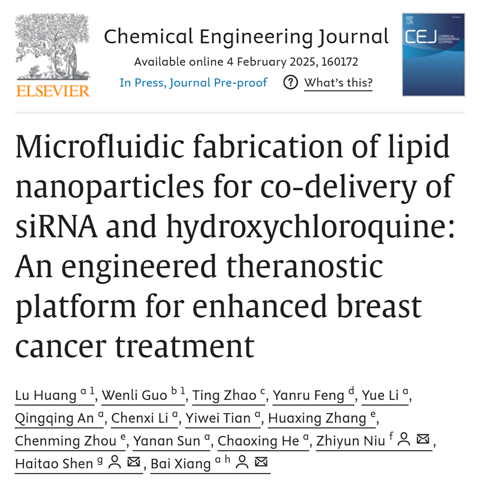 近期,河北医科大学向柏教授、申海涛教授联合河北医科大学第二医院牛志云副主任医师等人,开发了一种基于微流控技术的脂质纳米颗粒平台,可高效协同递送siRNA和羟氯喹,通过靶向CDK4/6基因沉默和自噬抑制,显著增强乳腺癌的治疗效果。相关研究以“Microfluidic fabrication of lipid nanoparticles for co-delivery of siRNA and hydroxychloroquine: An engineered theranostic platform for enhanced breast cancer treatment”为题目,发表在期刊《Chemical Engineering Journal》上。