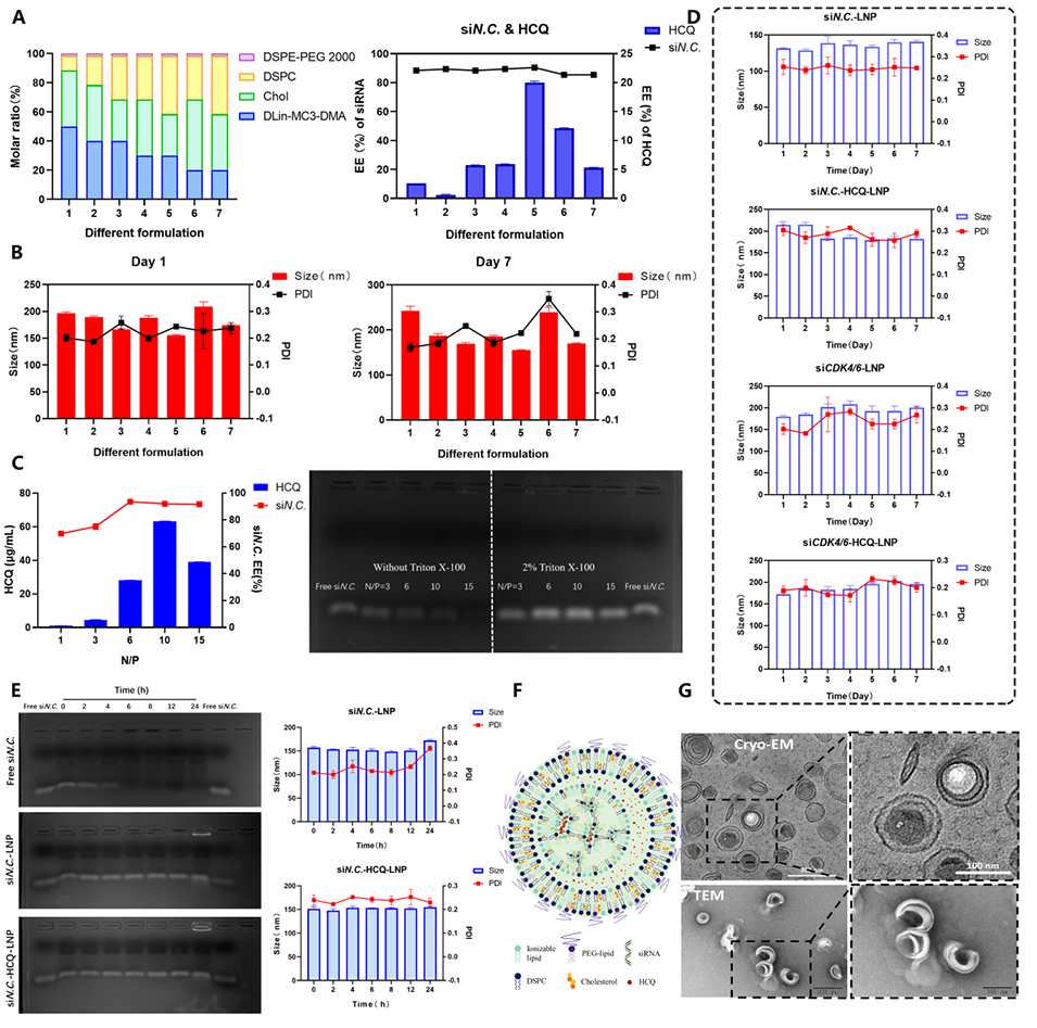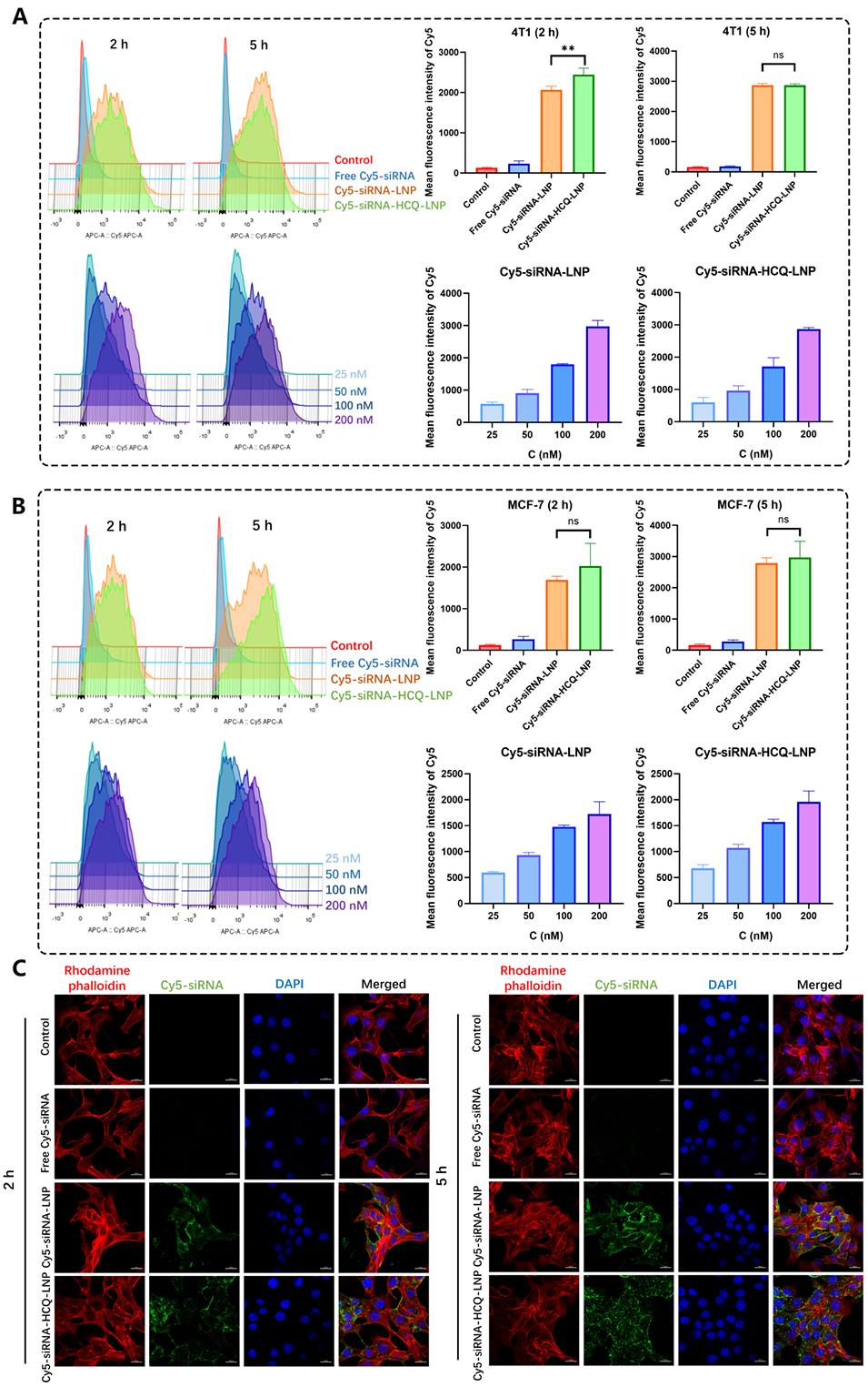 3、提升药物递送效率:利用微流控制备的LNP具备更高的细胞内化效率,能够减少载体的负表面电荷对细胞膜的排斥,显著提高siRNA的递送效率,同时通过HCQ介导的内涵体逃逸优化核酸释放。