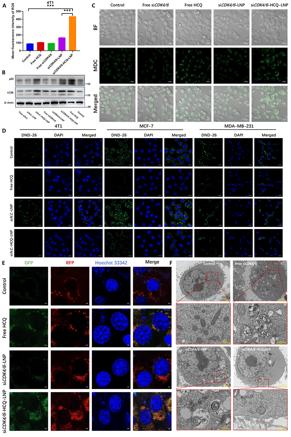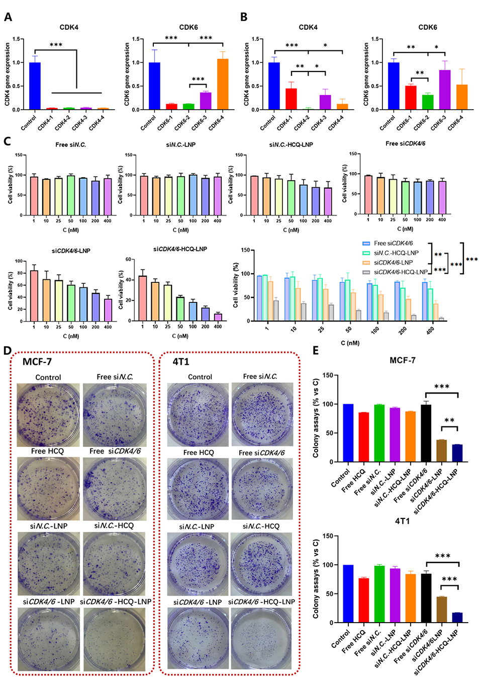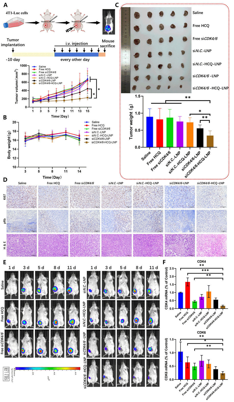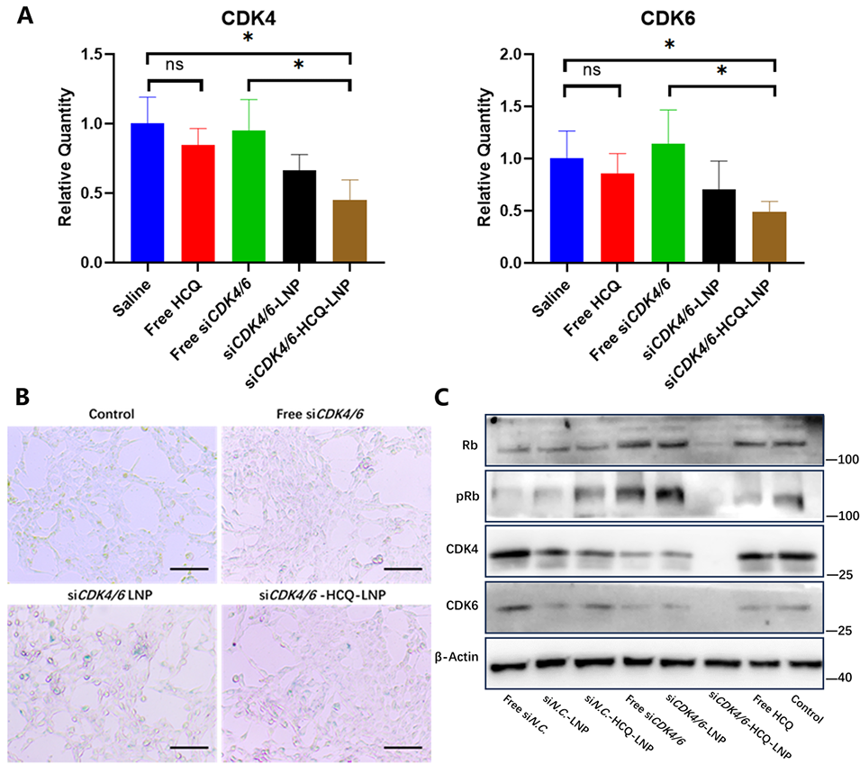 2、研究通过siRNA介导CDK4/6沉默,实现细胞周期阻滞,同时利用HCQ提高内涵体逃逸效率并抑制自噬,增强治疗效果。