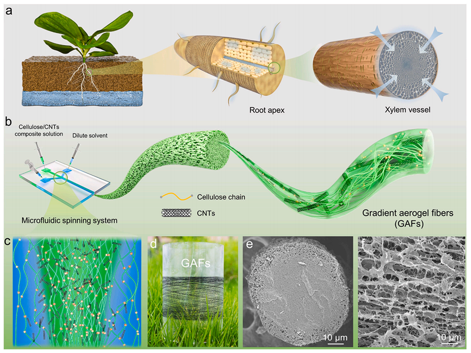 1、受植物根系高效水分运输机制的启发,本研究开发了一种微流体纺丝系统,用于连续生产梯度纳米多孔纤维素/CNT气凝胶纤维(GAF)。