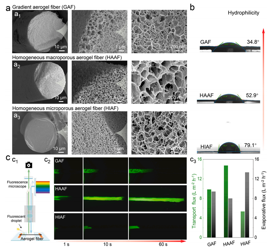 图2.不同结构气凝胶纤维中水传输行为的评估。