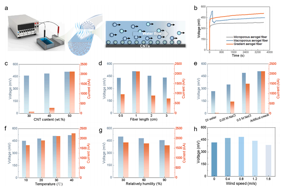 2、这些GAFs具有快速输水和高效蒸发的特性,每1cm长的纤维能够持续输出510mV的电压,优于均匀多孔纤维的448mV。