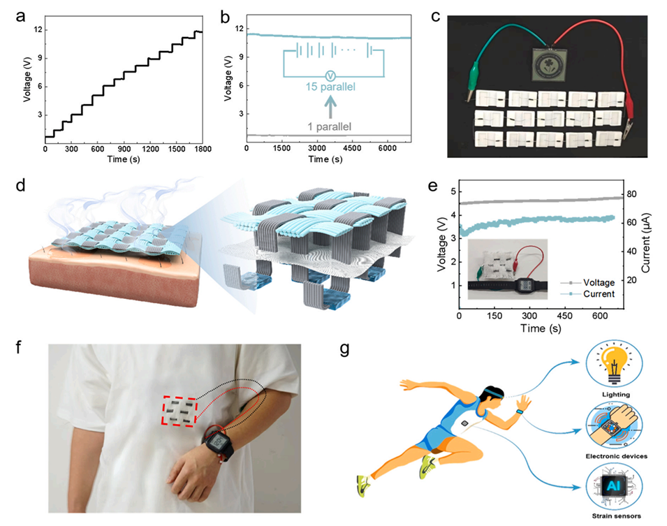 4、当集成到织物阵列中时,GAF可提供稳定的能量收集,在模拟人体汗液条件下提供4.5V的输出电压和60μA的电流,足以驱动腕表等小型设备。