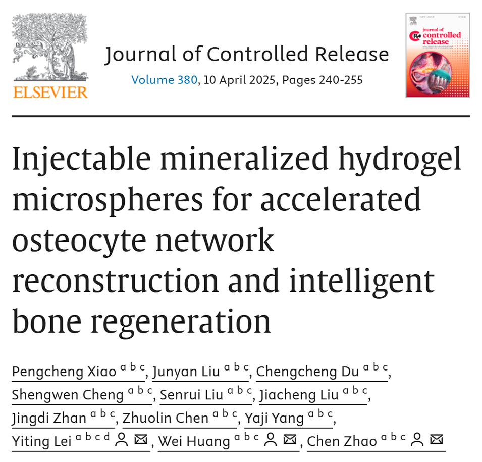 近期,重庆医科大学附属第一医院骨科黄伟教授、赵辰博士、雷一霆博士等人合作开发了一种注射用矿化水凝胶微球,通过提供理想的矿化环境和基质刚度,促进骨细胞网络重建和智能骨再生,为治疗大段骨缺损提供了一种新颖的策略。相关研究以“Injectable mineralized hydrogel microspheres for accelerated osteocyte network reconstruction and intelligent bone regeneration”为题目,发表在期刊《Journal of Controlled Release》上。