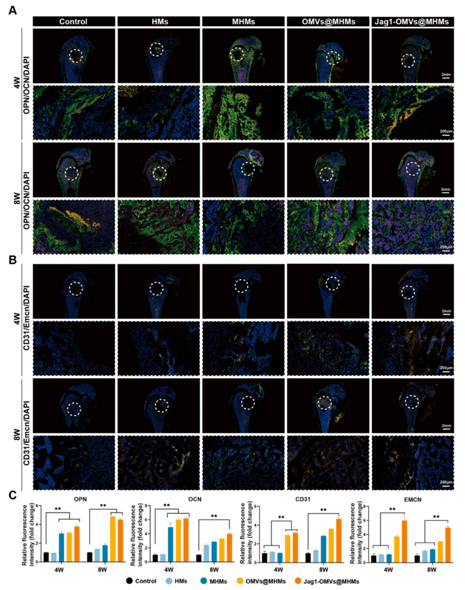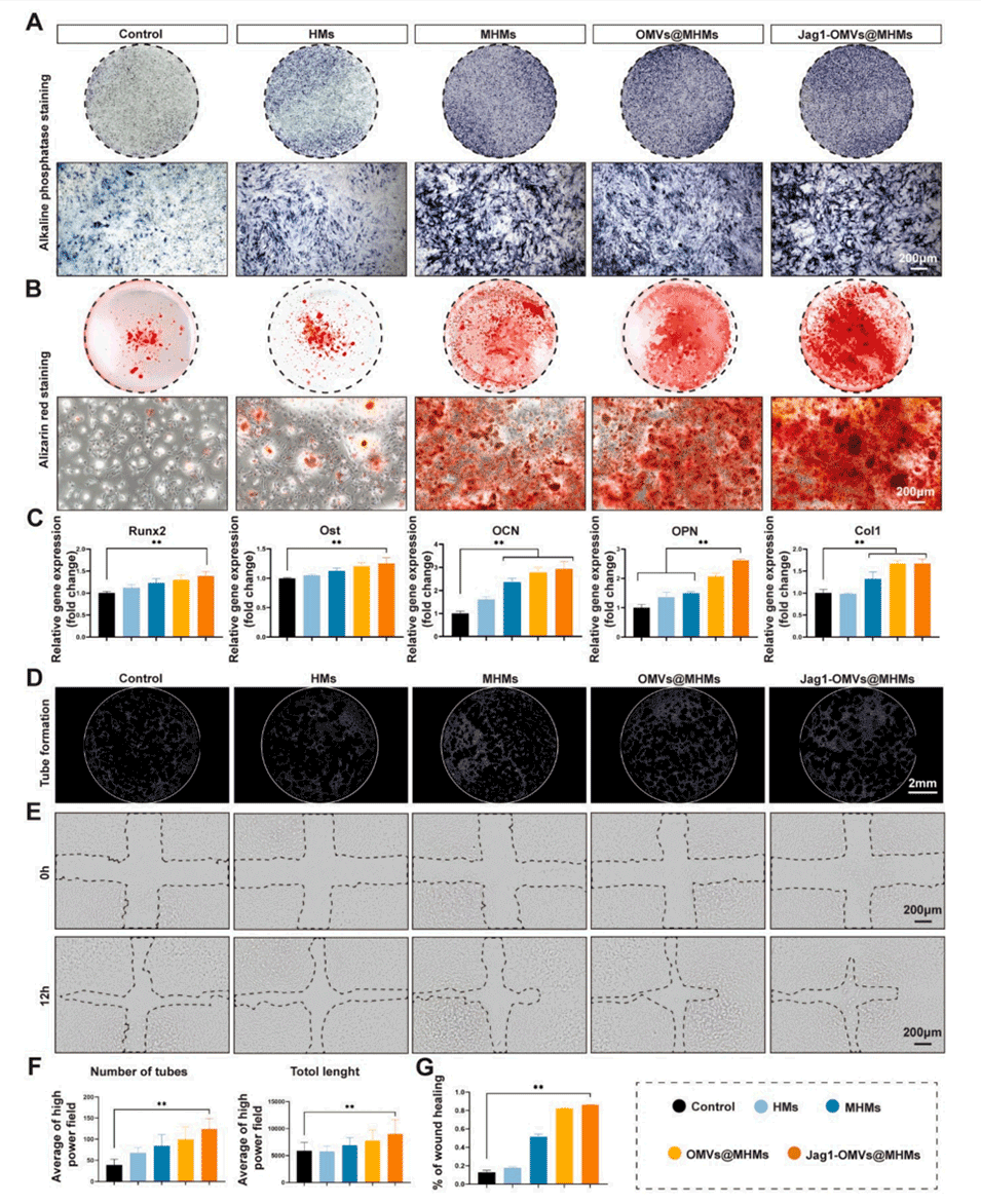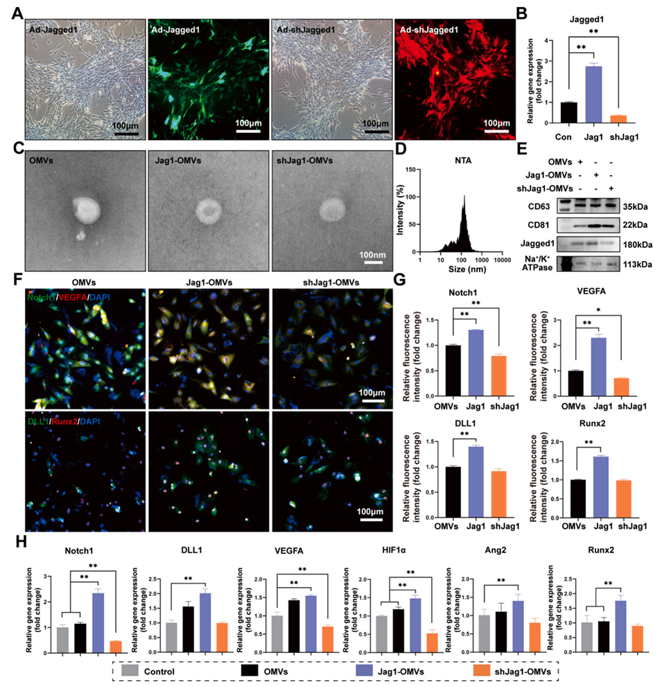- 高Jagged1表达的囊泡(Jag1-OMVs)的加入激活了Notch信号通路,引导骨细胞的成骨转化,并增强了骨网络的功能调控能力。