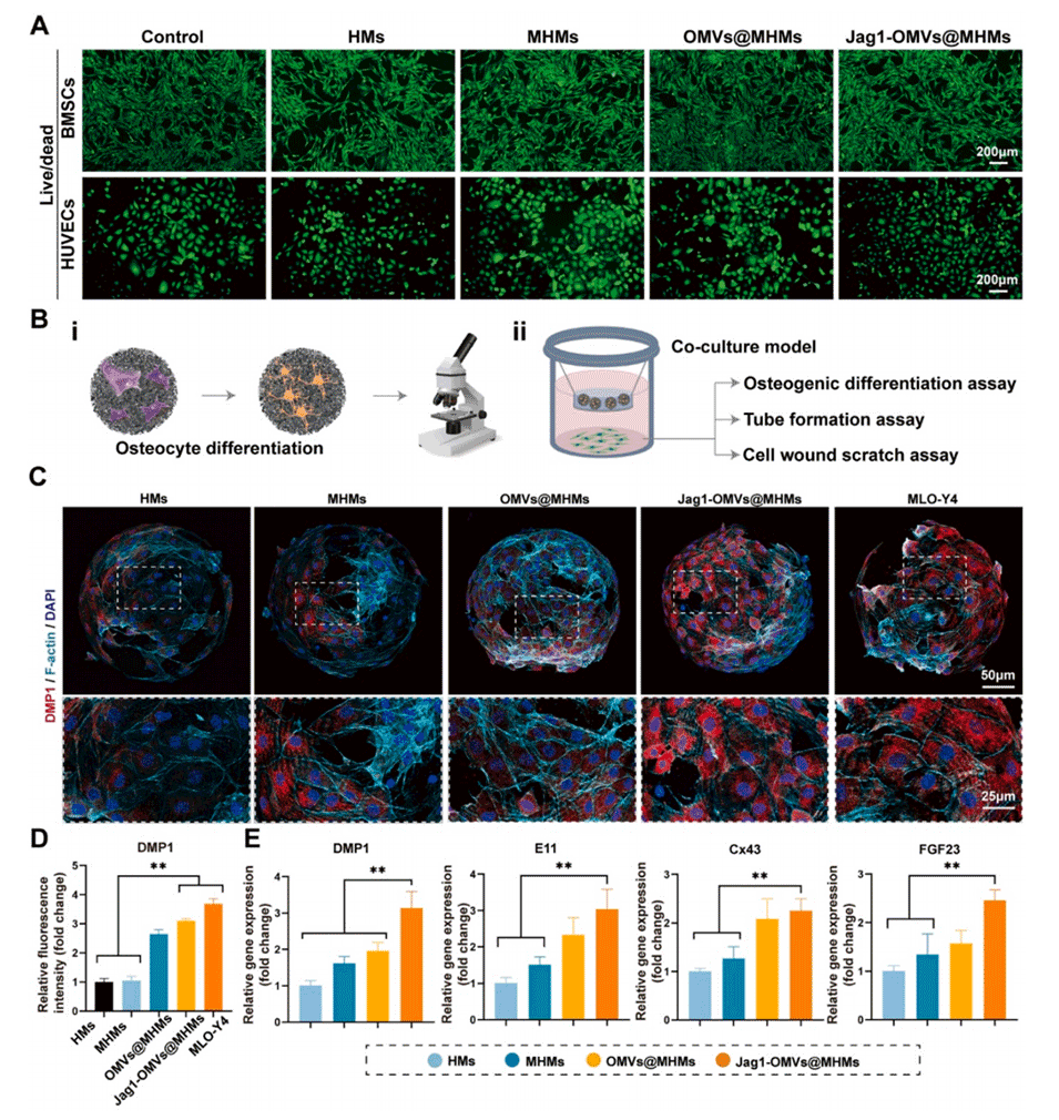 - 矿化水凝胶微球为骨细胞提供一个高矿化水平的三维微环境,加速了骨细胞标志物(如DMP1、Runx2)的表达,显著推进了骨细胞网络的成熟构建。