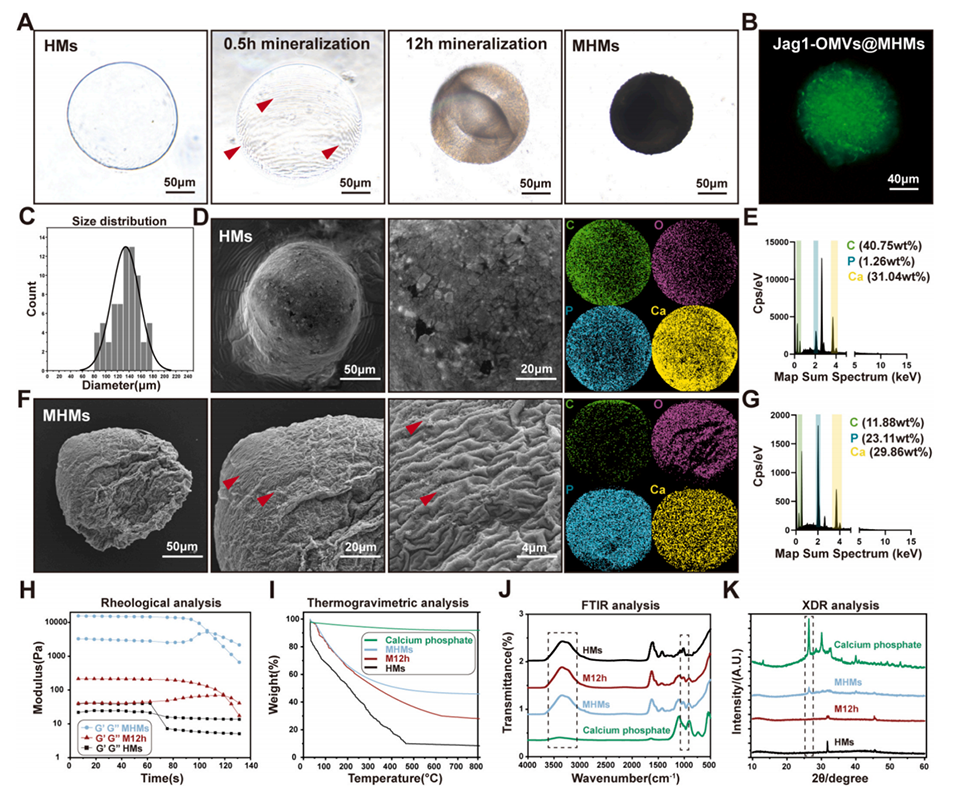 图2.矿化水凝胶微球(MHMs)的形态表征。