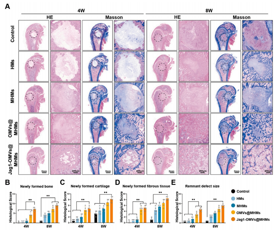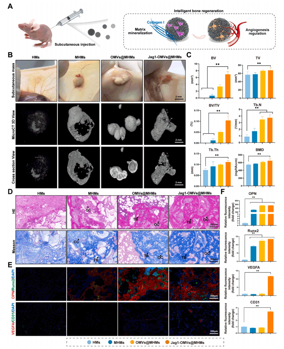 - 微球通过矿化和Notch通路的结合,实现对骨修复区域的动态调控,具备“智能”响应能力,能够协调骨修复和血管化双重过程。