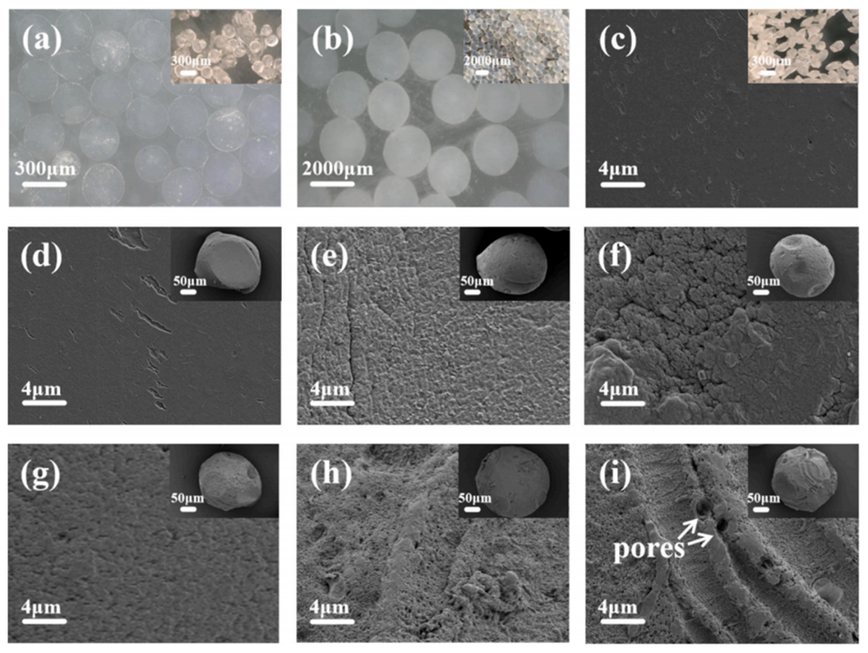 图1.(a)通过微流控技术制备的SC0.3-P4微球在湿润状态和干燥状态(插图)下的光学显微镜图像。(b)通过传统滴加法制备的SC0.3-P4微球在湿润状态下的光学显微镜图像(插图是干燥的SC0.3-P4微球照片)。(c)通过微流控技术制备的SA微球在干燥状态下的扫描电子显微镜(SEM)图像和光学显微镜图像(插图)。(d-i)不同CNF和PEG-400用量制备的SA/CNF微球的SEM图像,分别为SC0.1-P0、SC0.2-P0、SC0.3-P0、SC0.3-P1、SC0.3-P2和SC0.3-P4。
