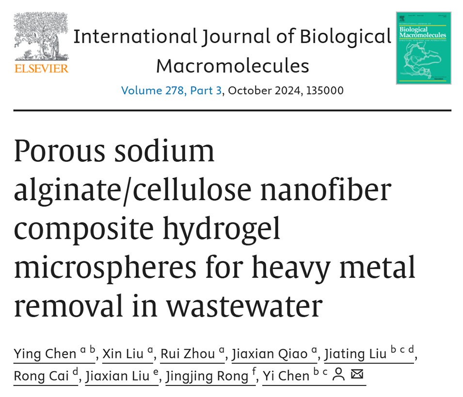 近期,湖南工业大学包装与材料工程学院陈一教授团队利用微流控技术制备了多孔海藻酸钠/纤维素纳米纤维(SA/CNF)复合水凝胶微球,通过引入CNF增强机械性能、聚乙二醇(PEG)提高孔隙率,旨在高效去除废水中的重金属离子(如Pb2+、Cu2+和Cd2+),并探讨了影响吸附过程的多种因素。相关研究以“Porous sodium alginate/cellulose nanofiber composite hydrogel microspheres for heavy metal removal in wastewater”为题目,发表在期刊《International Journal of Biological Macromolecules》上。