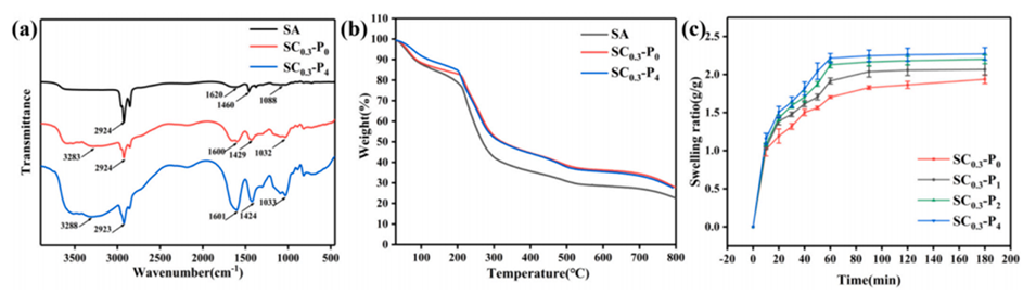 图2.(a)SA、SC0.3-P0和SC0.3-P4的FT-IR光谱及其(b)在N2中的TGA曲线。(c)用不同PEG-400剂量制备的SA/CNF微球的膨胀率随时间的变化。