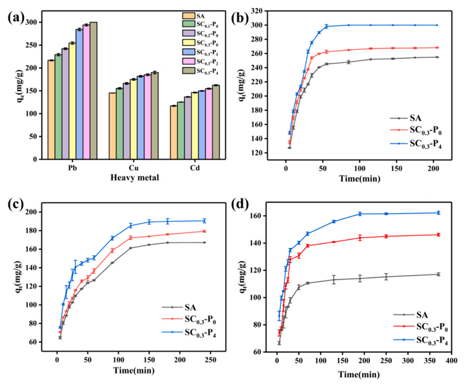 图3.(a)用不同CNF和PEG-400剂量制备的SCx-Py微球对Pb2+、Cu2+和Cd2+的吸附容量(pH=5,C0=300mg/L,25℃)。(b-d)SCx-Py微球从水溶液中吸附不同金属离子的动力学(pH=5,25℃):(b)Pb2+,(C)Cu2+和(d)Cd2+。