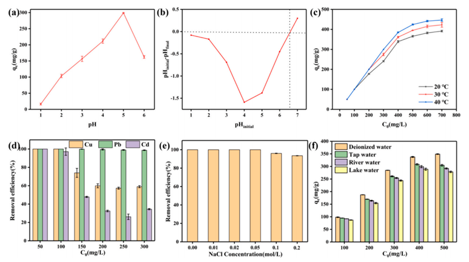 在低pH值时,由于H+与Pb2+竞争吸附位点,吸附能力较低,而随着pH值升高至5,吸附能力显著增强;但在pH值超过6时,Pb(OH)2的沉淀会导致吸附效果下降。