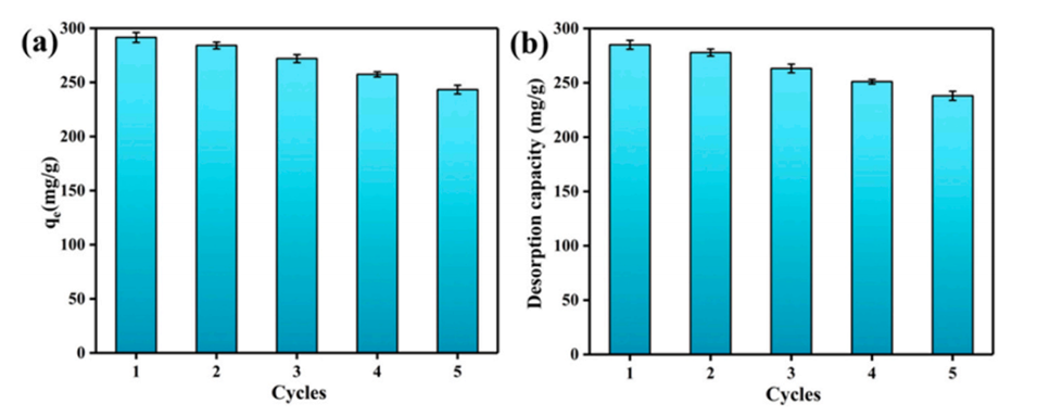 图5.(a)SC0.3-P4微球在五个连续的吸附/解吸循环中对Pb2+的吸附和(b)解吸。