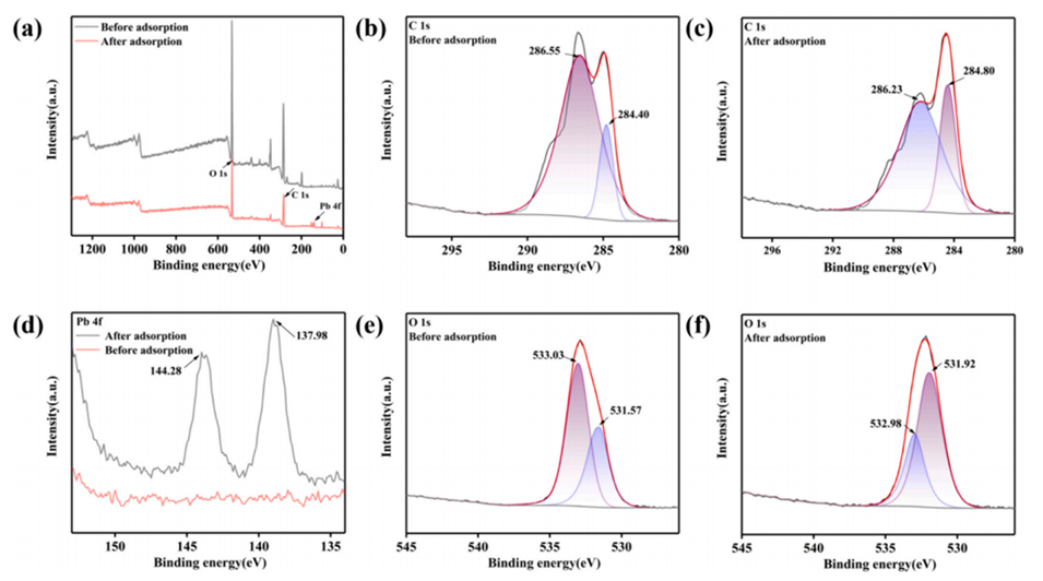 图6.(a)SC0.3-P4微球吸附前后的XPS光谱;SC0.3-P4微球(b)吸附前和(c)吸附后的C1s峰光谱;(d)SC0.3-P4微球吸附前后Pb4f峰光谱;SC0.3-P4微球(e)吸附前和(f)吸附后的O1s峰光谱。