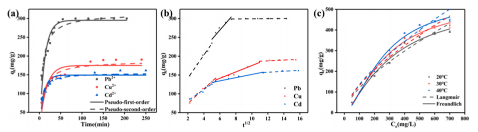 图7.(a)SC0.3-P4微球从水溶液中吸附Pb2+、Cu2+和Cd2+的吸附动力学曲线及拟合曲线和(b)颗粒内扩散曲线(pH=5,25℃)。(c)SC0.3-P4微球从水溶液中吸附Pb2+的等温线和拟合曲线(pH=5)。