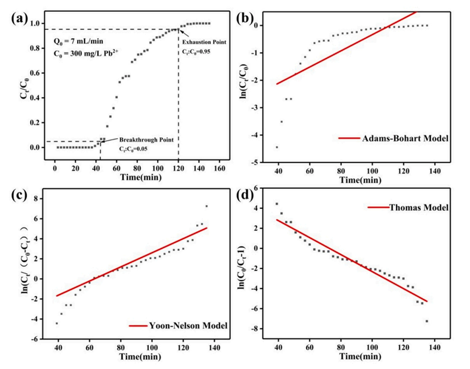 图8.(a)Pb2+通过填充有SC0.3-P4微球的吸附柱的穿透曲线。(b)Adams-Bohart模型拟合曲线。(c)Yoon-Nelson模型拟合曲线。(d)托马斯模型拟合曲线。C0和Ct分别是进水和出水浓度。