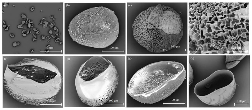图5.H3组中空PNIPAM微胶囊的SEM图像(a-h),整体(a)、表面(b-d)和横截面(e-h)。
