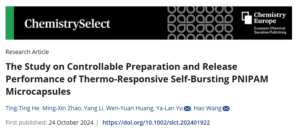 近期,西南石油大学化学化工学院余亚兰副教授、王豪教授等通过微流控技术制备了单分散热响应自爆型PNIPAM微胶囊,以实现脂溶性药物的快速按需释放,展现了其在储存与释放活性物质方面的广阔应用潜力。相关研究以“The Study on Controllable Preparation and Release Performance of Thermo‐Responsive Self‐Bursting PNIPAM Microcapsules”为题目,发表在期刊《ChemistrySelect》上。