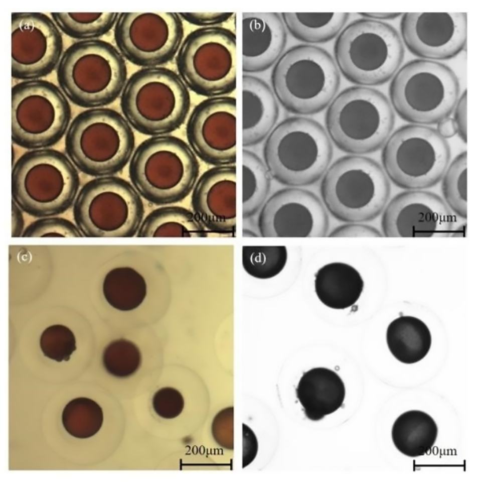 图2.H2(a)组和H4(b)组乳液以及H2(c)组和H4(d)组微胶囊的光学图。