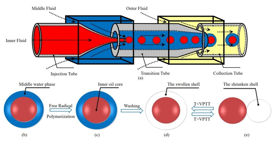 图1.双同轴微流控装置示意图(a),O/W/O乳液作为合成模板(b),通过自由基聚合固化微胶囊(c),在体积相变温度(VPTT)以下清洗后的微胶囊(d),在体积相变温度(VPTT)以上,壳层发生热响应收缩并挤出内油核(e)。