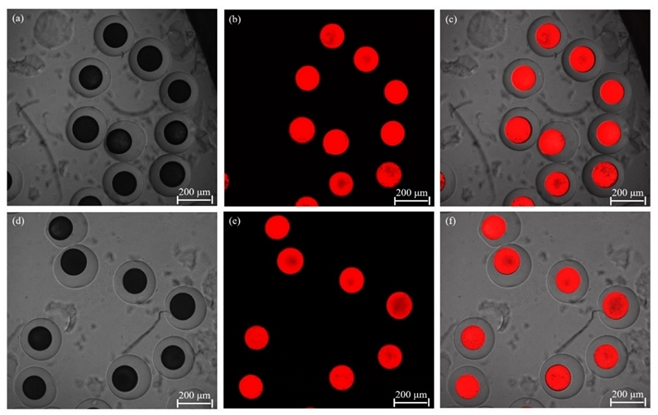 图4.H2和H6组内油相中含有Lumogen Red F300的PINPAM微胶囊的荧光图像(a-f)。亮场(a,d)、暗场(b,e)、叠加场(c,f)。