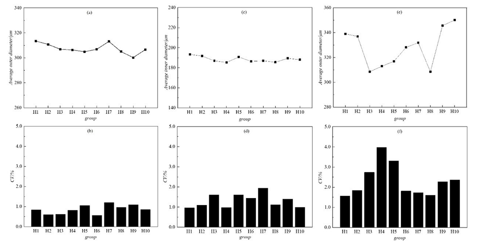 图3.乳液的外径分布(a)及其相应的CV值(b),乳液的内径分布(c)及其相应的CV值(d),微胶囊的外径分布(e)及其相应的CV值(f)。