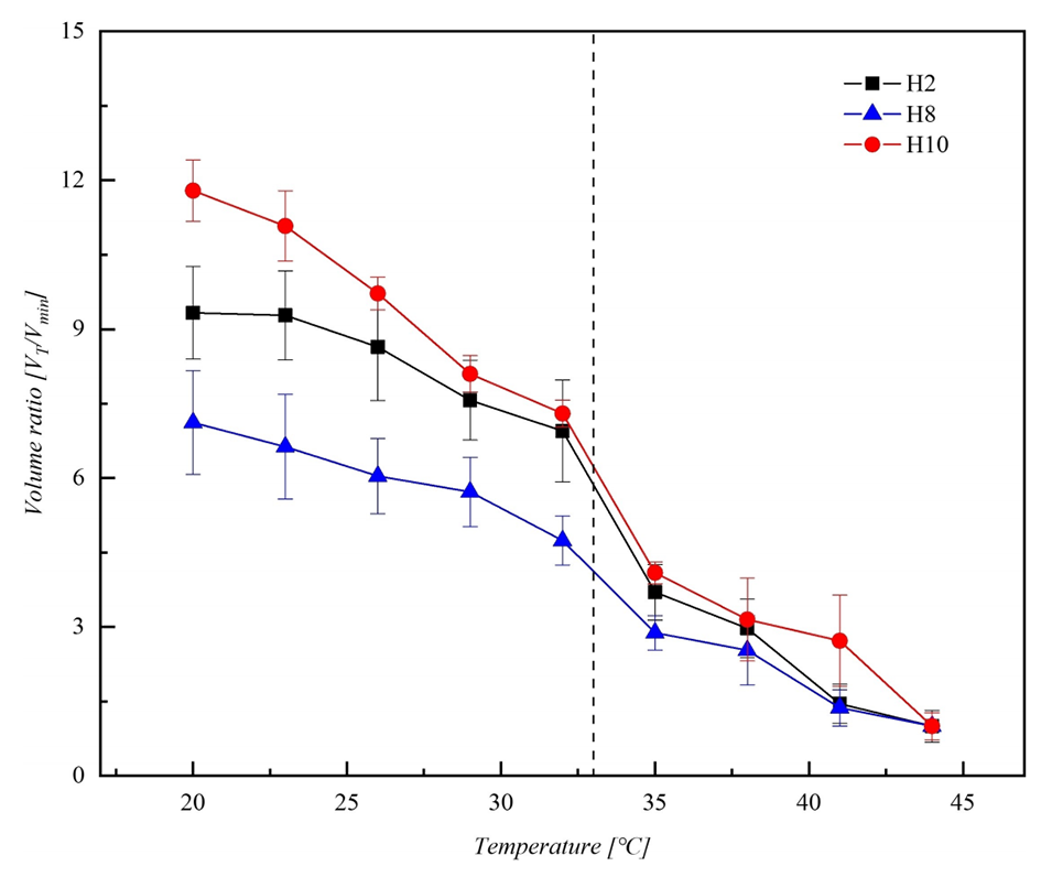 图6.温度对不同MBA和NIPAM含量的PNIPAM微胶囊体积比的影响。