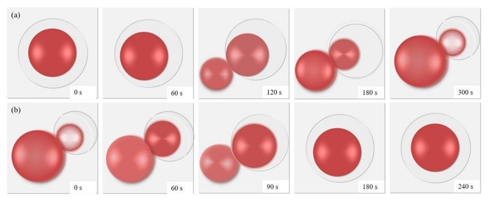 图8.H2组内油相中含有Lumogen Red F300的PNIPAM微胶囊的动态热响应行为示意图。热响应收缩和挤出油核的过程(a),以及热响应膨胀和重新吸收油核的过程(b)。