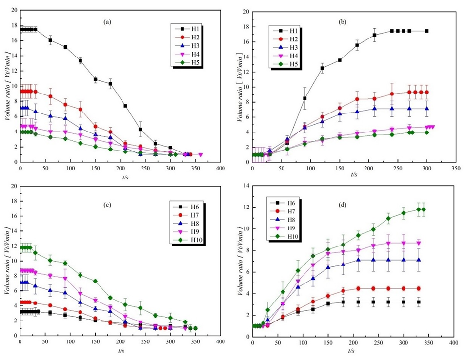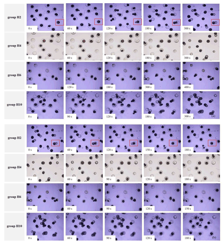 图7.H2、H4、H6和H10组PNIPAM微胶囊在特定时间间隔内的动态热响应行为的光学显微镜图像。热响应收缩和挤出油核的过程(a),热响应膨胀和重新吸收油核的过程(b)。