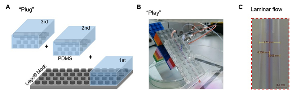 图1用于水凝胶纤维纺丝的“即插即用”微流体装置。(A)设备组装的“插入”步骤示意图。(B)组装好的微流体装置的数码照片。(C)PnP微流体装置创建的层流数码照片。