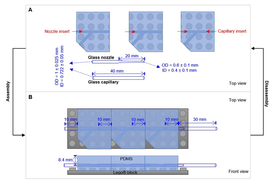 3、降低技术门槛:不同于传统微流控设备可能需要复杂的制造程序和专用仪器(如高分辨率3D打印机或洁净室设施),模块化设计可通过基础实验室材料(如PDMS和玻璃喷嘴)实现,降低了设备运行和开发的技术门槛。
