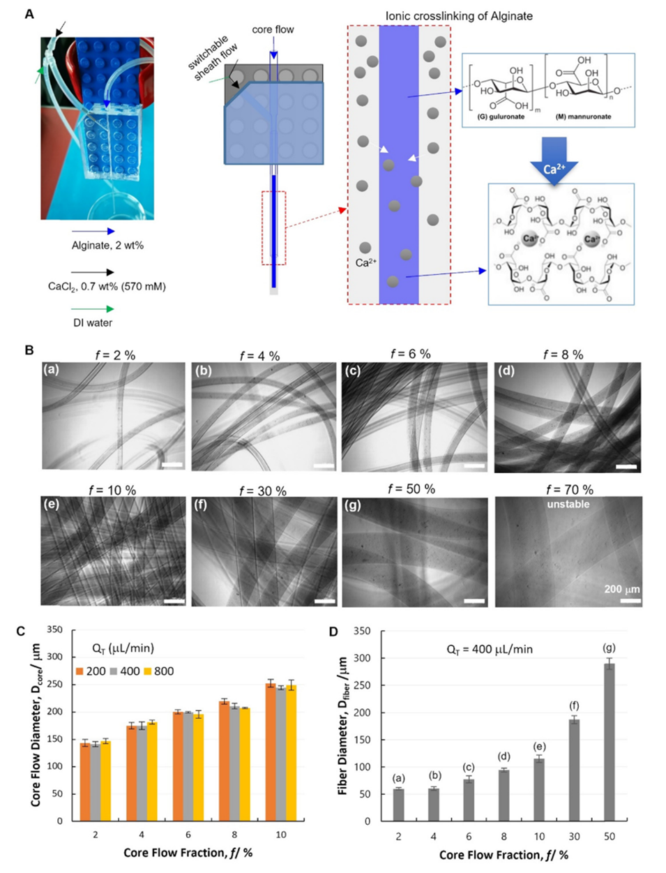 单模块:通过核心流分数(f=Qcore/QT)控制纤维直径,当总流量QT在200–800 μL/min范围内变化时,纤维直径仅由f决定(p<0.05),实现流速与纤维尺寸的解耦。