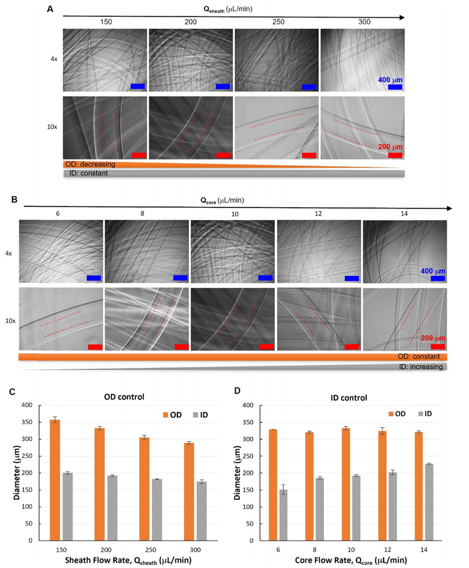 双模块:鞘流(Qsheath)调控纤维外径(150–300 μL/min时外径从357 μm降至289 μm),核心流(Qcore)调控内径(6–14 μL/min时内径从151 μm增至219 μm),ANOVA验证两者独立调控(p>0.05)。