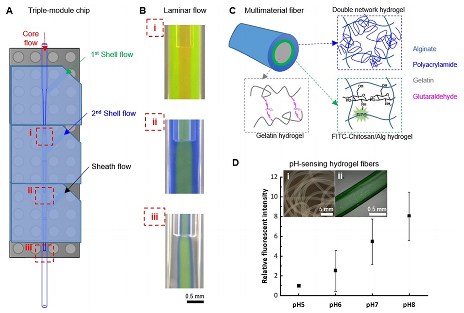 三模块:引入三层流体协同(核心流:明胶;第一壳层:Alg-FITC-壳聚糖;第二壳层:丙烯酰胺预聚液),通过光交联和离子交联双重固化稳定结构,结合pH敏感性实现生物监测功能。