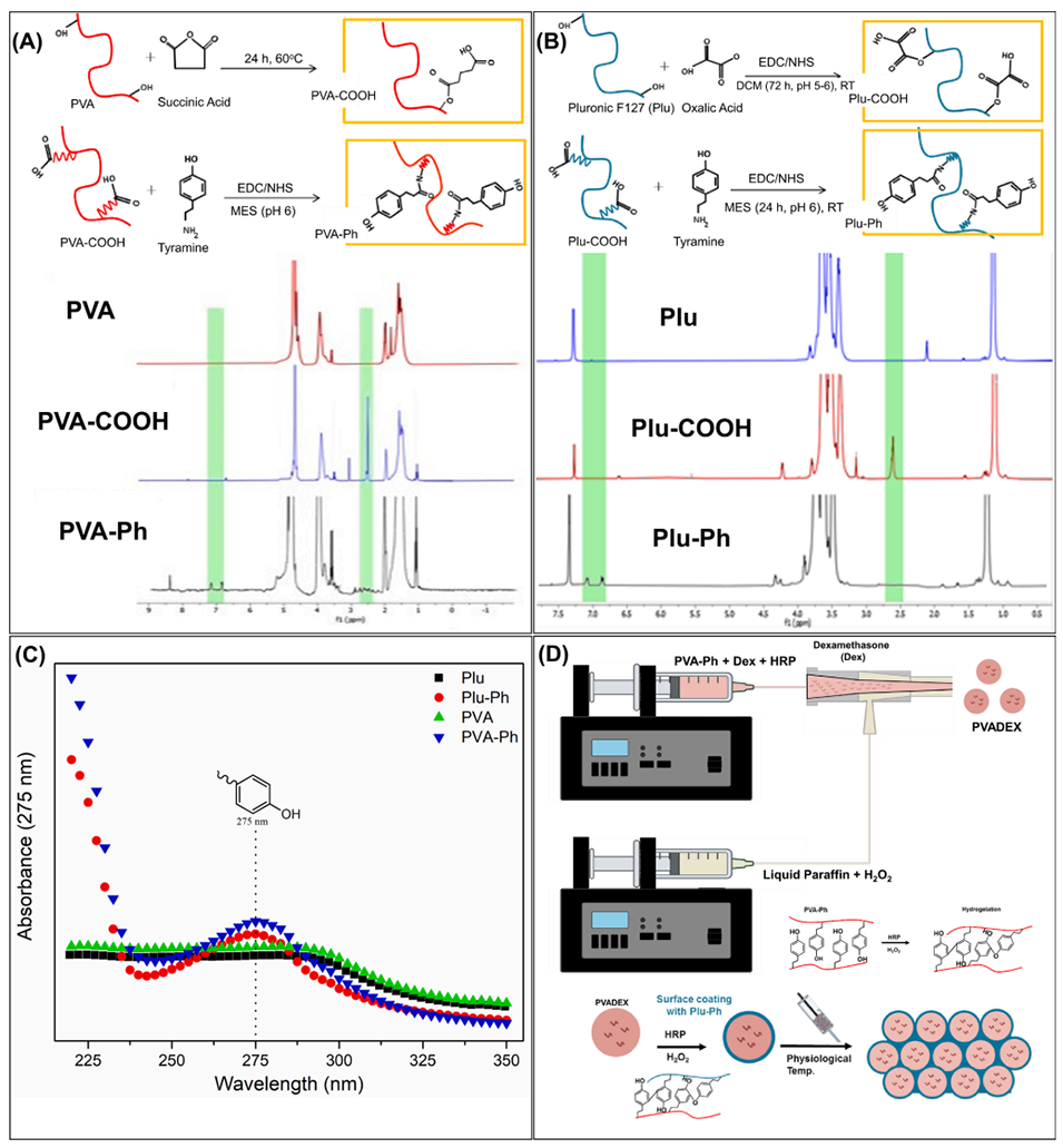 图1 A-B:展示了PVA、PVA-COOH和PVA-Ph以及Plu、Plu-COOH和Plu-Ph的1H NMR谱图,证实了在PVA和Plu结构中成功引入了酚基团。C:显示了在275 nm处的吸光峰,证实了PVA-Ph和Plu-Ph中酚基团的存在。D:描述了通过微流体装置制备PVA-Ph微粒并形成水凝胶的过程,包括微流体装置的结构和操作步骤。