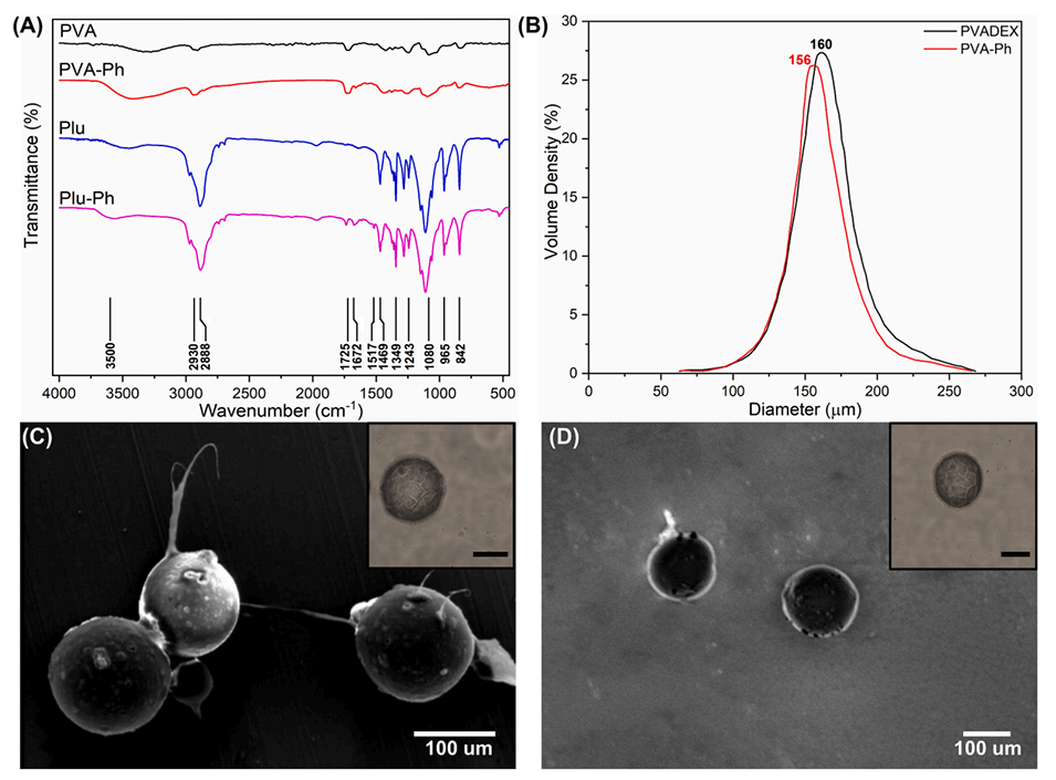 图2 A:展示了PVA、PVA-Ph、Plu和Plu-Ph的FTIR谱图,证实了PVA和Plu成功转化为PVA-Ph和Plu-Ph。B:通过激光衍射分析仪测得PVADEX和PVA-Ph微粒的尺寸分布,显示微粒尺寸均匀。C:SEM图像显示了PVADEX微粒的表面形貌,证实了其球形和单分散性。D:倒置光学显微镜图像进一步证实了PVA-Ph微粒的形态和尺寸均匀性。
