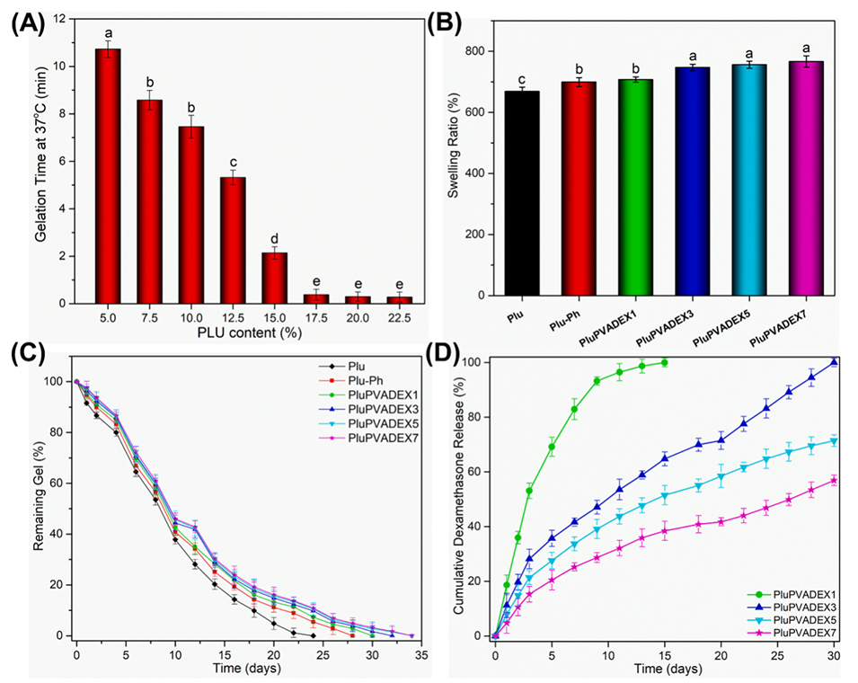 图3 A:展示了不同浓度Pluronic F-127溶液在37℃下的凝胶时间,确定了17.5%为最佳浓度。B:比较了Plu、Plu-Ph和Plu-PVADEX水凝胶在37℃下的膨胀比,发现PVADEX微粒的加入显著提高了水凝胶的吸水能力。C:展示了不同水凝胶在37℃和pH 7.4条件下的水解降解情况,发现PVADEX微粒的加入对水凝胶的降解有一定影响。D:比较了不同浓度PVADEX微粒的水凝胶在PBS中的地塞米松释放情况,发现PVADEX微粒的加入显著延长了药物释放时间。