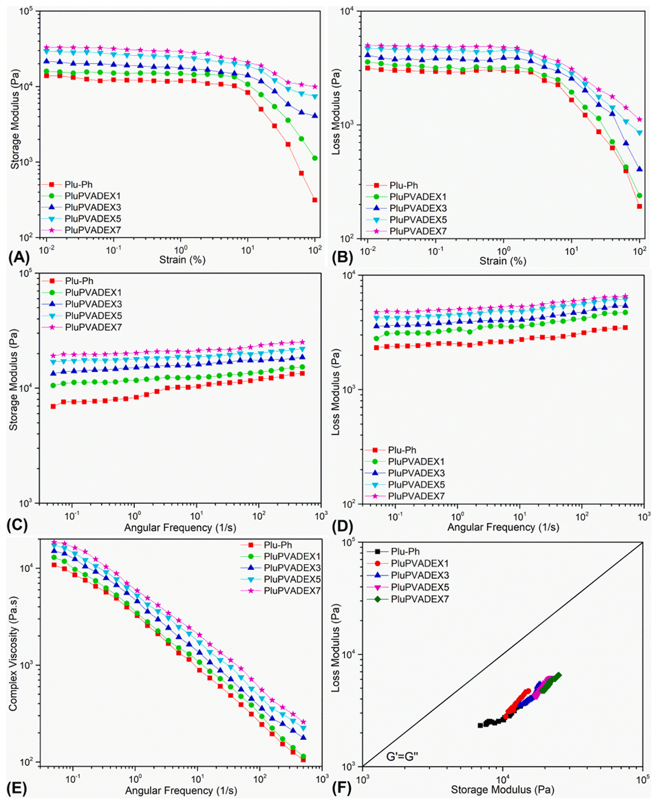 图4 通过不同参数评估PluPVADEX水凝胶的流变学特性,包括A:储能模量与应变的关系,B:损耗模量与应变的关系,C:不同频率下的储能模量,D:不同频率下的损耗模量,E:不同频率下的复数粘度,F:修正的Cole-Cole曲线,突出结构变化、粘弹性特性,以及分子间相互作用和网络稳定性方面的见解。