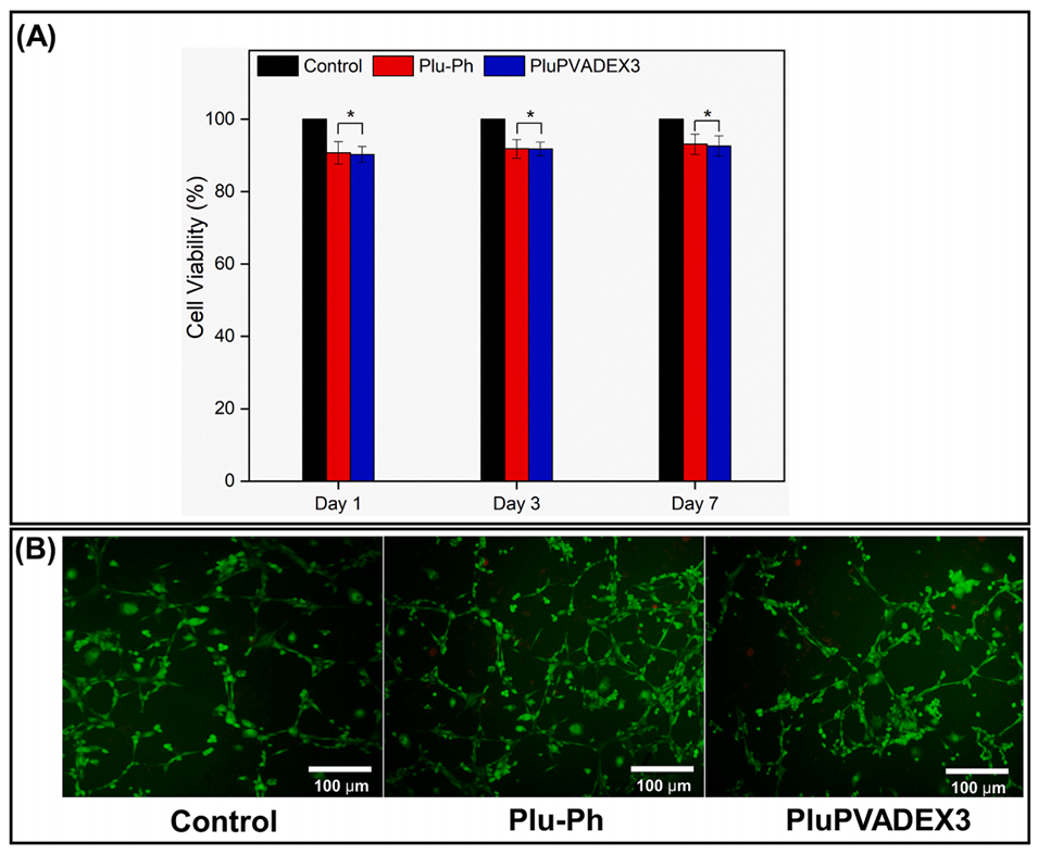 图5 A:展示了Plu-Ph和PluPVADEX3水凝胶对细胞活性的影响,结果显示水凝胶对细胞无毒性。B:通过活/死细胞染色实验,进一步证实了水凝胶的生物相容性,显示水凝胶对细胞无毒性且不影响细胞形态。