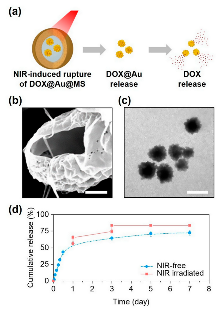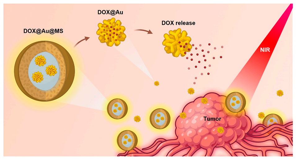 图1.示意图展示了DOX-Au@MSs的设计和形成,用于控制释放癌症药物和持久杀灭癌细胞。在近红外光(NIR)照射下,DOX@Au@MSs会因金纳米颗粒(AuNPs)的光热效应而破裂,随后释放DOX@Au,进而以时空可控的方式释放DOX。