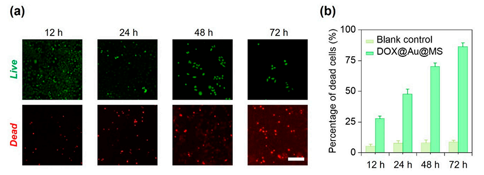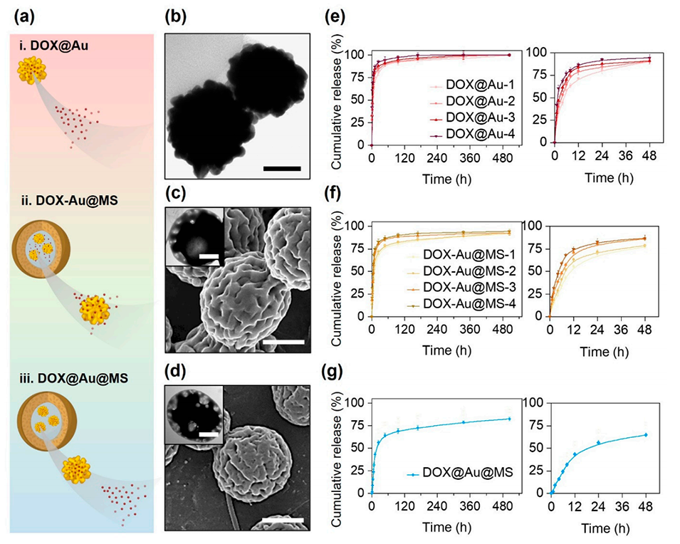 1、本研究针对化疗药物(如阿霉素,DOX)的细胞毒性引发的严重副作用问题,开发了一种新型核壳结构药物递送系统(DOX@Au@MSs)。