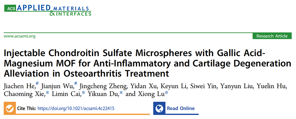 炎症和软骨退化是骨关节炎(OA)治疗中的关键挑战。在减轻炎症和活性氧的不利影响的同时实现持续的药物疗效仍然是一个重大挑战。近期,南方医科大学第十附属医院(东莞市人民医院)蔡立民教授、Yikuan Du、Xiong Lu等研究人员与西南交通大学谢超鸣教授团队合作,开发了一种新型注射用硫酸软骨素微球(CM@pGM)。该微球封装含葛根素(PA)的没食子酸-镁金属有机框架(GA-Mg MOF),通过改善关节炎症微环境和促进软骨修复,显著抑制炎症及软骨退变,延缓骨关节炎进程,展现出良好的治疗潜力。相关研究以“Injectable Chondroitin Sulfate Microspheres with Gallic Acid-Magnesium MOF for Anti-Inflammatory and Cartilage Degeneration Alleviation in Osteoarthritis Treatment”为题目,发表在期刊《ACS Applied Materials & Interfaces》上。